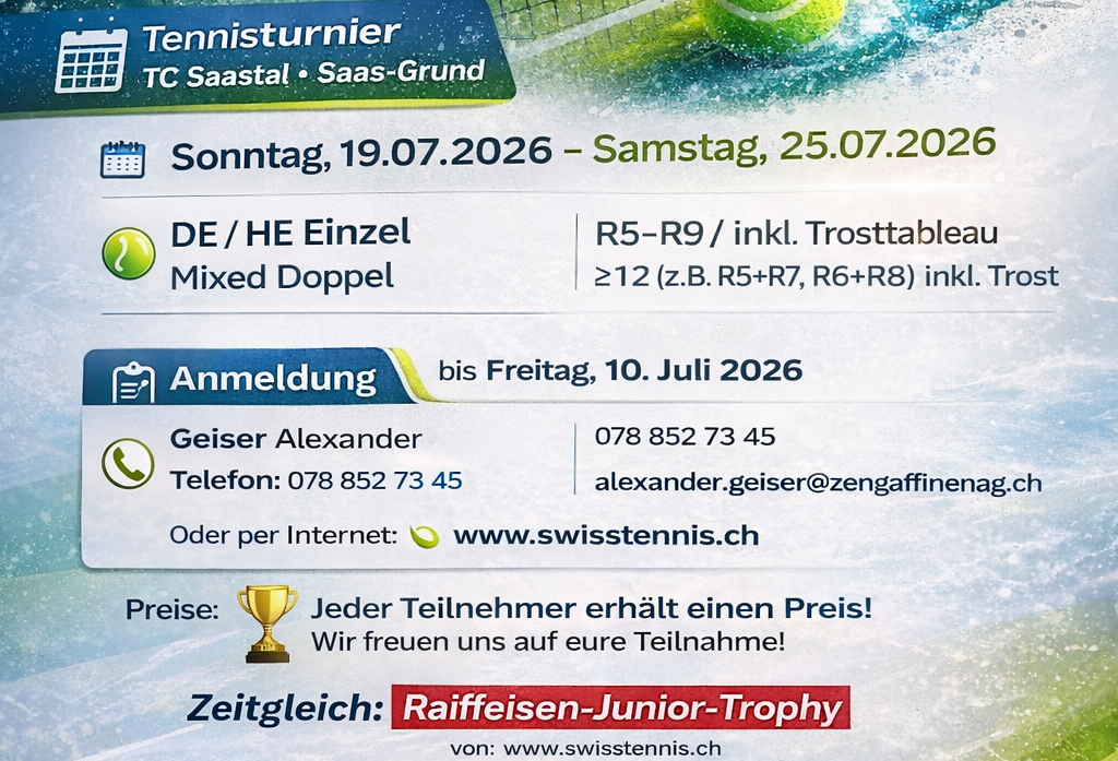 Willkommen auf der Internetseite des Tennisclubs Saastal - ehemals TC Saas-Grund. Der TC Saas-Grund wurde am 7.7.1977 mit 7 Mitglieder gegründet. Heute zählt der TC Saastal zu einer der wichtigsten Clubs im Saastal und hat rund 140 Mitglieder